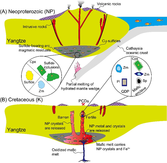 研究表明,沙溪矿床根植于一个富硫化物、偏还原的新元古代弧岩浆下地壳,该地壳单元富集了大量铜和金等金属。在白垩纪时期,一股新的高氧化性基性岩浆侵入并“冲刷”了这一还原性根区,使其中的硫化物发生氧化分解,释放出铜、金等金属元素,并随岩浆迁移至上地壳形成成矿岩体。这一过程的证据被完整地记录在辉石、锆石、尖晶石及斜长石的生长环带中。