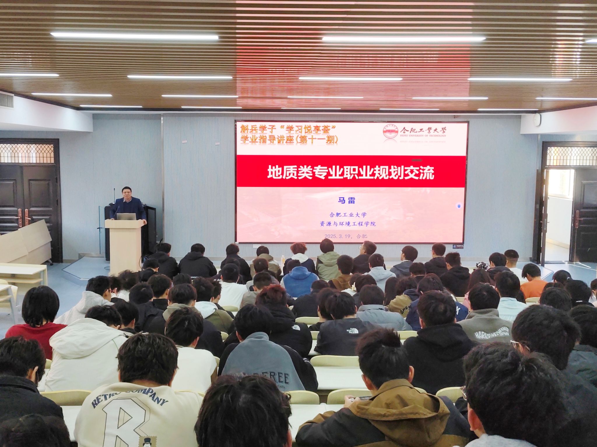 马雷以“地质类专业职业规划交流”为题,以职业环境初识、自我认知初定、职业发展初思、职业发展初悟等方面为切入口,详细探讨了地质类专业就业前景、就业规划、职业感悟等方面的内容,他勉励同学们一要锚定方向,科学规划职业路径,在实践中动态调整;二要深耕专业,强化核心竞争力,在课程学习、科研创新中锤炼专业技能;三要知行合一,厚植发展根基,争做既能扎根大地,又敢仰望星空的新时代地质人!